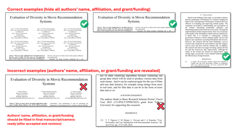 Please note that as we use a double-blind review process, authors’ names and affiliations should not be written on the manuscript when it is submitted. This is necessary to ensure fairness in the reviewing process. Authors are expected to follow the format example as shown in the image below.